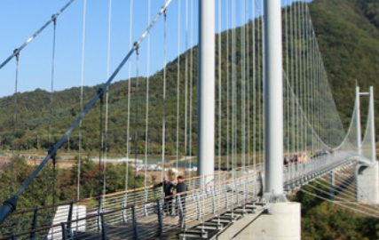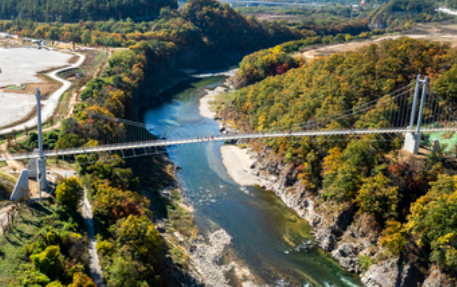 한탄강 협곡에 놓여진 한탄강 하늘다리는 50m 상공에서 한탄강의 협곡을 조망할 수 있습니다. 또한 한탄강의 유명한 주상절리와 연계하여 구석구석 비경을 감상할 수 있어 많은 관광객들이 찾는곳입니다. 다리 중간에는 바닥이 유리로된 스카이워크 구간도 있어 짜릿함을 느껴볼수 있습니다. 드라마 '사랑의 불시착'으로 더욱 유명해진 한탄강 하늘다리를 건너 주상절리를 산책해보시며 힐링을 느껴보시기 바랍니다.